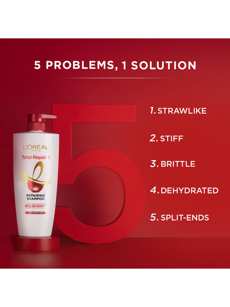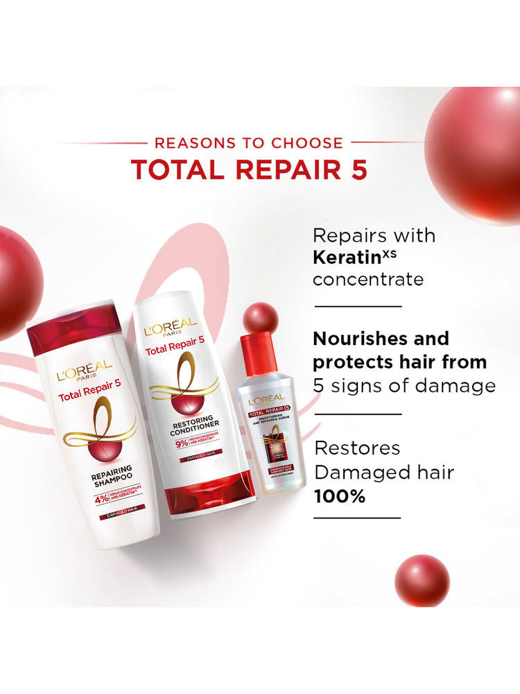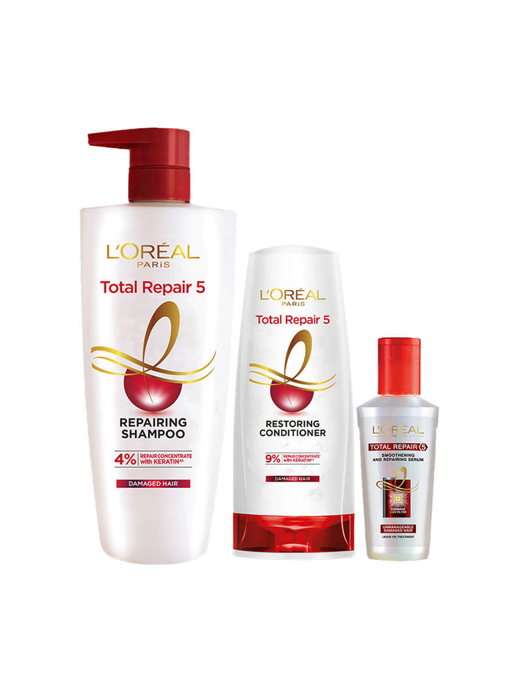 L'Oréal Paris Total Repair 5 Combo includes shampoo, conditioner, and serum to comprehensively target 5 signs of hair damage. Infused with Keratin XS and ceramides, this set restores strength, smoothness, and shine to weak and lifeless hair.