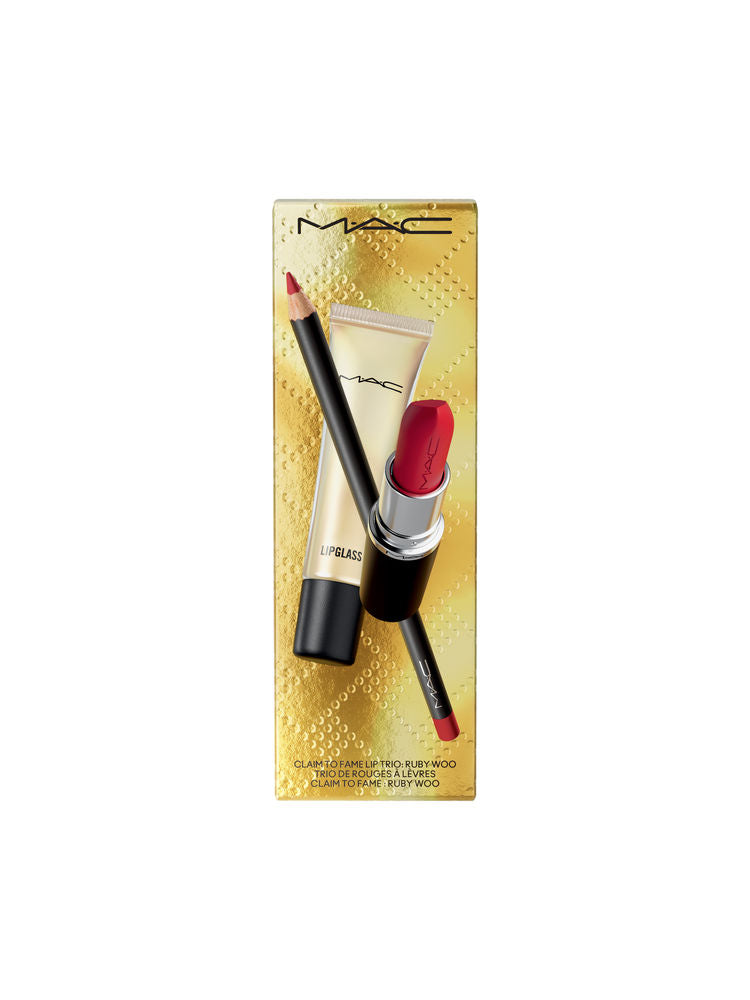 Own the classic red with the M.A.C Ruby Woo Lip Trio. Featuring a lipstick, lipglass, and lip pencil in the iconic cool-toned red, this coordinated set delivers bold color, shine, and definition for any occasion.