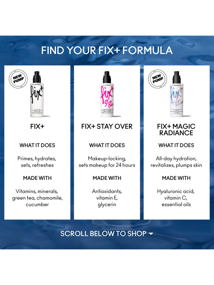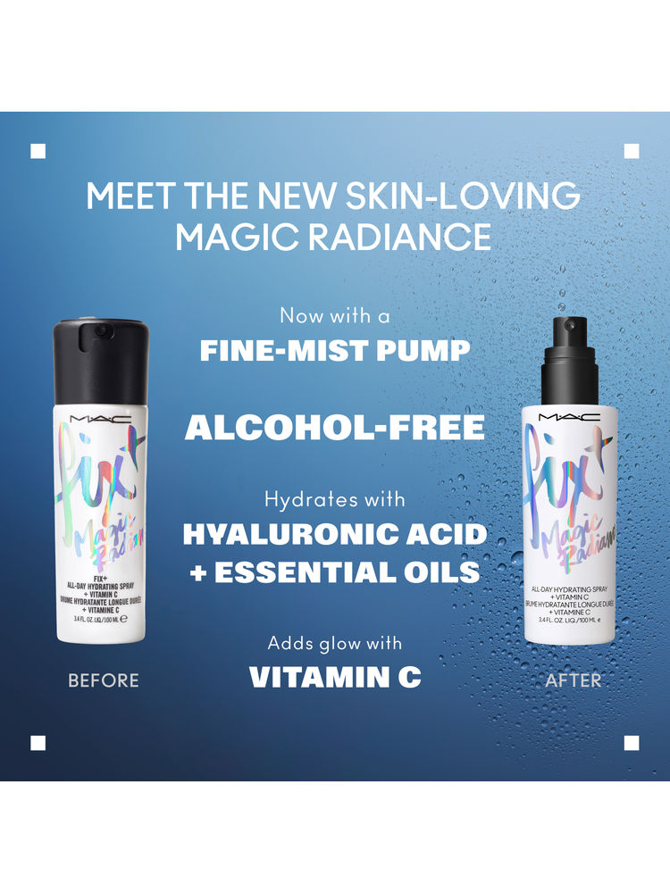 Give your skin the glow it deserves with M.A.C Fix+ Magic Radiance. Infused with vitamin C, hyaluronic acid, and essential oils, this radiant-boosting mist deeply hydrates while brightening the complexion. Ideal for dry or dull skin, it delivers a luminous, healthy finish that lasts. Use it as a prep spray, setting mist, or glow booster—your skin will thank you.