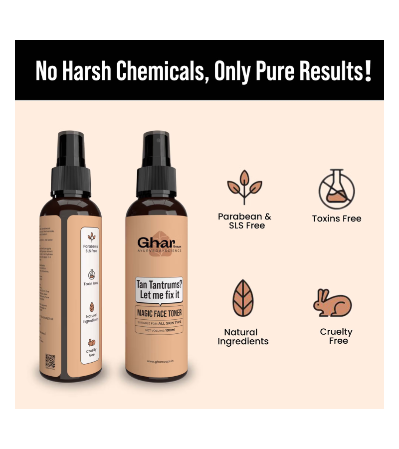 GET DIRECTIONMagic Face Toner by Ghar Soaps is a lightweight, expertly formulated solution designed to balance and prepare your skin for optimal absorption of serums and moisturizers. This 100ml toner works to refine pores, remove residual impurities, and restore your skin's natural pH after cleansing. Infused with carefully selected ingredients, it helps enhance skin texture and clarity while maintaining hydration. Ideal for daily use, this toner transforms your skincare routine into a professional-grade regimen that addresses multiple skin concerns with a single, essential step.