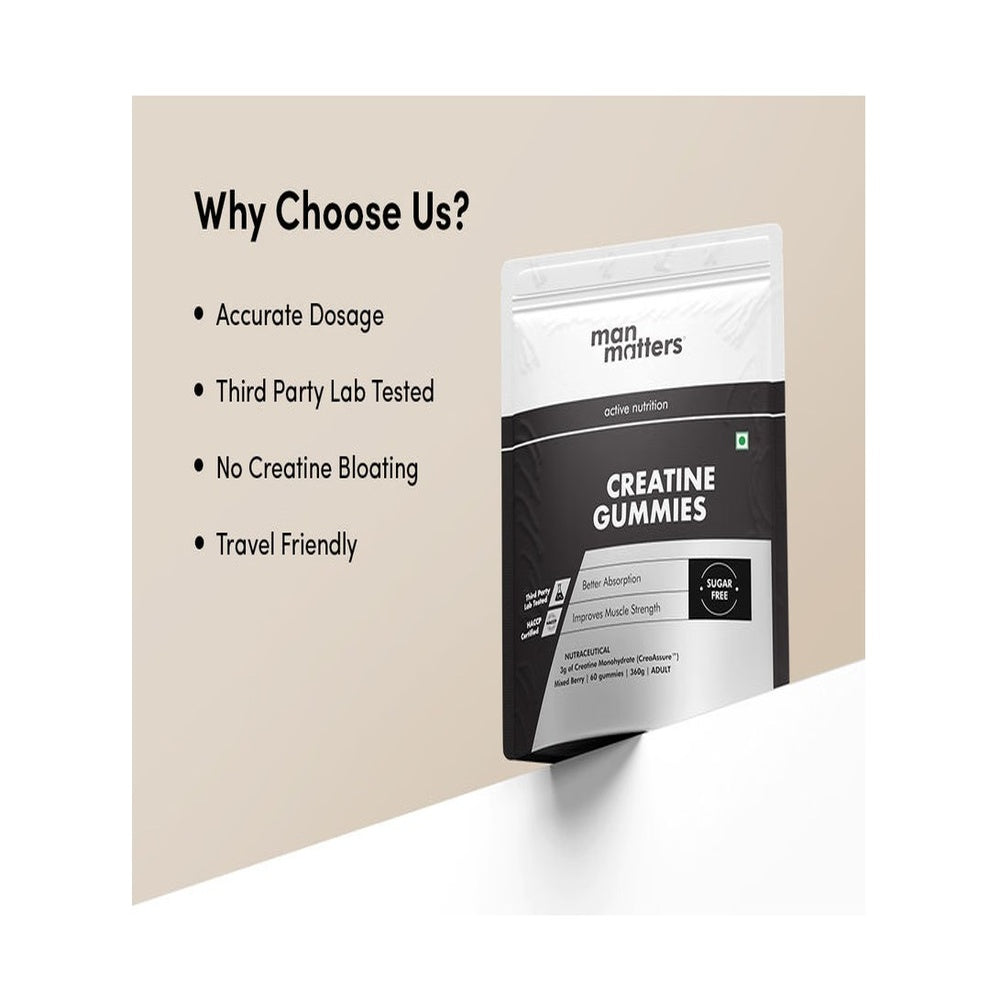 Man Matters Creatine Gummies offer a convenient and effective way to support muscle strength and recovery. Each gummy delivers a precise dose of creatine, a well-researched supplement known to enhance muscle energy production during high-intensity exercise. This formulation aids in improving workout performance and promoting faster muscle repair, making it an ideal choice for athletes and fitness enthusiasts seeking a practical alternative to traditional creatine powders or capsules.