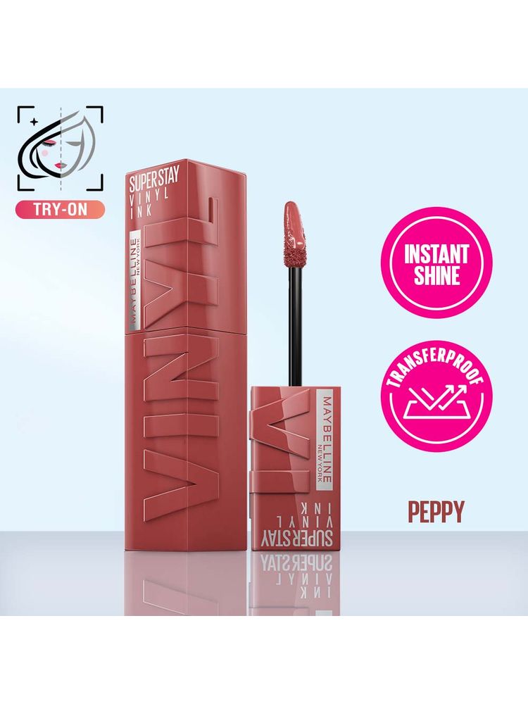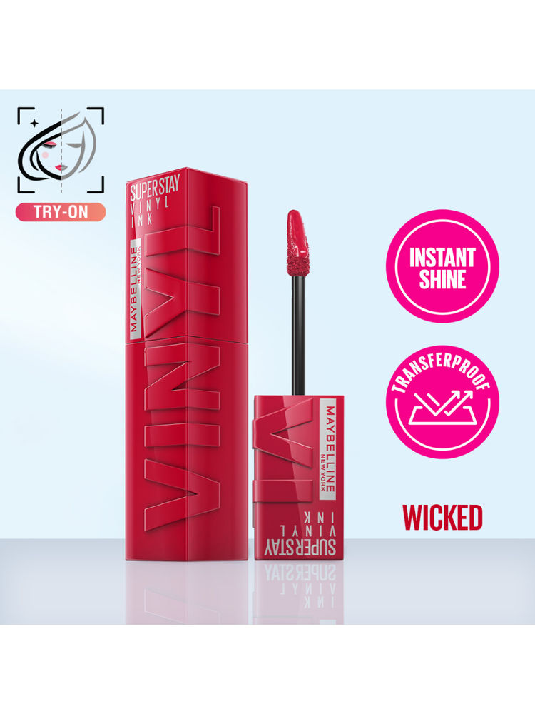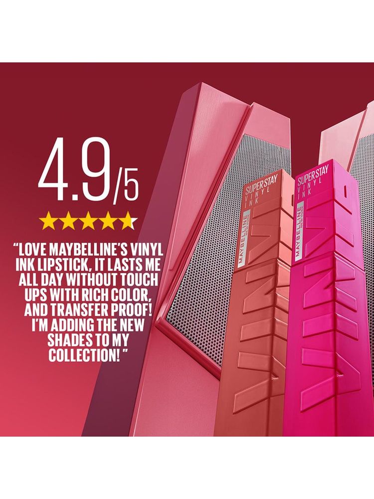Maybelline New York Super Stay Vinyl Ink Liquid Lipstick, Instant Shine Lasts Up To 16H - 10 Lippy(4.2ML) To apply this longwear lipstick—simply shake, swipe and go. For the perfect vinyl lip, first shake up Maybelline Vinyl Ink Lipstick for at least 5 seconds before applying. Next apply to your lips using its precise flocked tip applicator. Lastly, let it dry and go! #shakeswipego delivers intense pigment with a striking vinyl shine that lasts up to 16 hours. Designed for bold beauty lovers, this liquid lipstick stays put without smudging or fading throughout the day. The lightweight, no-budge formula keeps lips hydrated and vibrant from morning to night.
