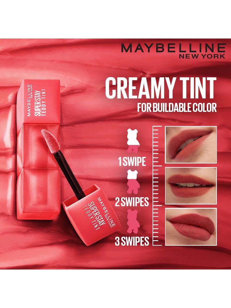 Maybelline New York Superstay Teddy Tint - Lip And Cheek Color - Knee High(5ml) Apply super stay teddy tint to clean dry lips.Build more color as per your desired look.Dab on cheeks and blend with fingers or brush.Let it dry. delivers intense pigment with a striking vinyl shine that lasts up to 16 hours. Designed for bold beauty lovers, this liquid lipstick stays put without smudging or fading throughout the day. The lightweight, no-budge formula keeps lips hydrated and vibrant from morning to night.
