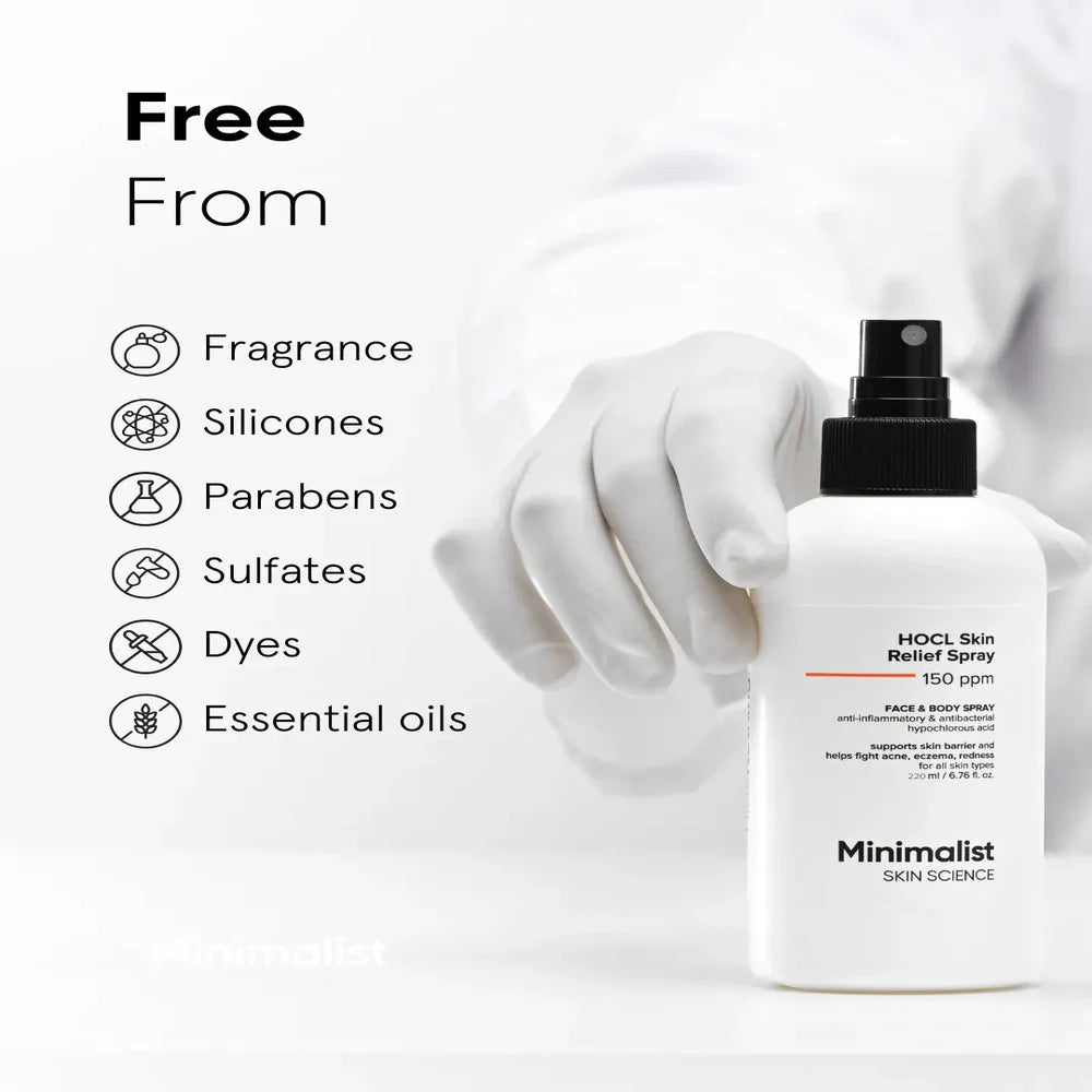 Minimalist HOCl Skin Relief Spray 150ppm (220ml) offers gentle, effective skin soothing with a 150ppm concentration of hypochlorous acid. This spray supports skin relief by naturally calming irritation and promoting a balanced skin environment. Its formulation is designed for sensitive or compromised skin, making it ideal for daily use to maintain comfort and assist in skin recovery. The convenient 220ml size provides ample supply for consistent application.