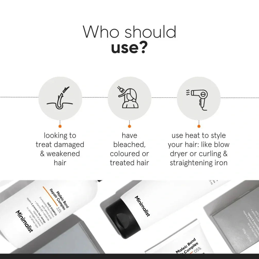 This 200 gm Minimalist Maleic Bond Repair Complex Hair Mask features a potent 5% concentration of maleic acid combined with transglutaminase, amino acids, and ceramides. Designed to restore and strengthen damaged hair bonds, it improves hair resilience and texture while maintaining hydration. Its targeted formulation aids in repairing structural damage, promoting healthier, smooth, and manageable hair with professional efficacy.