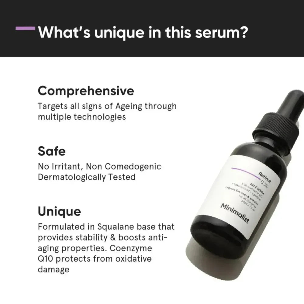 Minimalist Retinol 0.3% Face Serum is formulated to effectively reduce fine lines and wrinkles by promoting skin cell renewal. This lightweight serum delivers a precise concentration of retinol, known for its anti-aging benefits, to help improve skin texture and firmness while minimizing visible signs of aging. Ideal for those seeking a targeted solution to maintain youthful, radiant skin with consistent use.