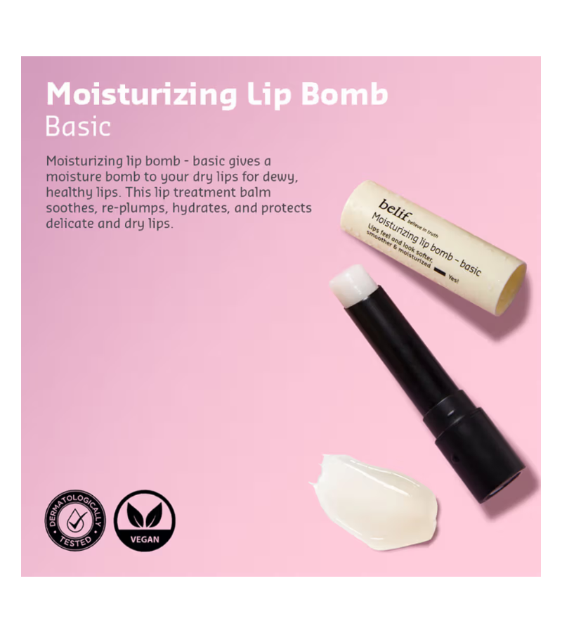 Belif's Moisturizing Korean Lip Bomb is a concentrated lip mask designed to address dryness and chapping. Formulated with shea butter and nourishing botanicals, this 3g lip balm delivers intensive hydration to delicate lip skin. The rich, creamy texture melts into lips, creating a protective barrier that locks in moisture throughout the day and night. Ideal for those seeking targeted lip care, this Korean beauty staple restores softness and suppleness to compromised lips.