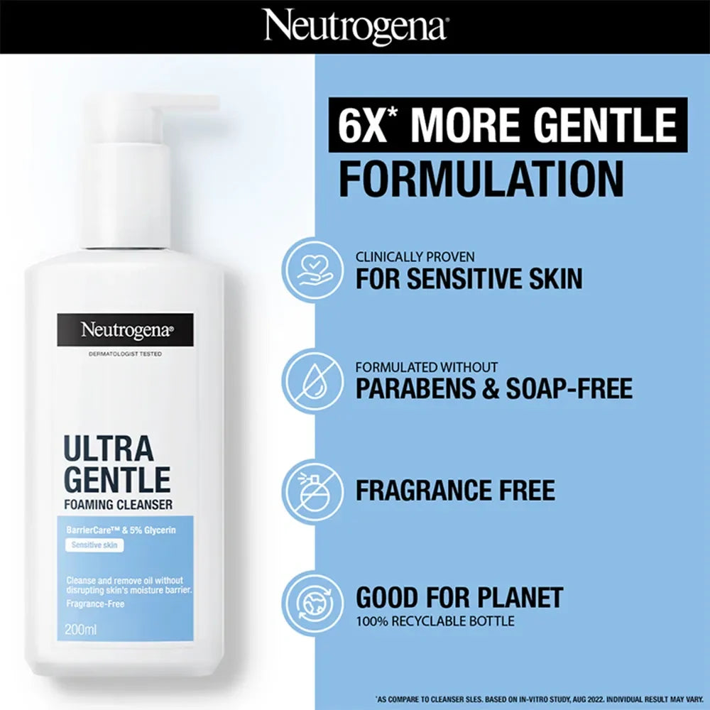 Neutrogena Ultra Gentle Foaming Cleanser (200ml) delivers a mild yet effective cleansing experience designed for sensitive skin. Its gentle foaming action removes dirt, oil, and makeup without stripping natural moisture, promoting a balanced, comfortable complexion. Ideal for daily use, this cleanser helps maintain skin’s health while minimizing irritation, making it suitable for sensitive and reactive skin types.