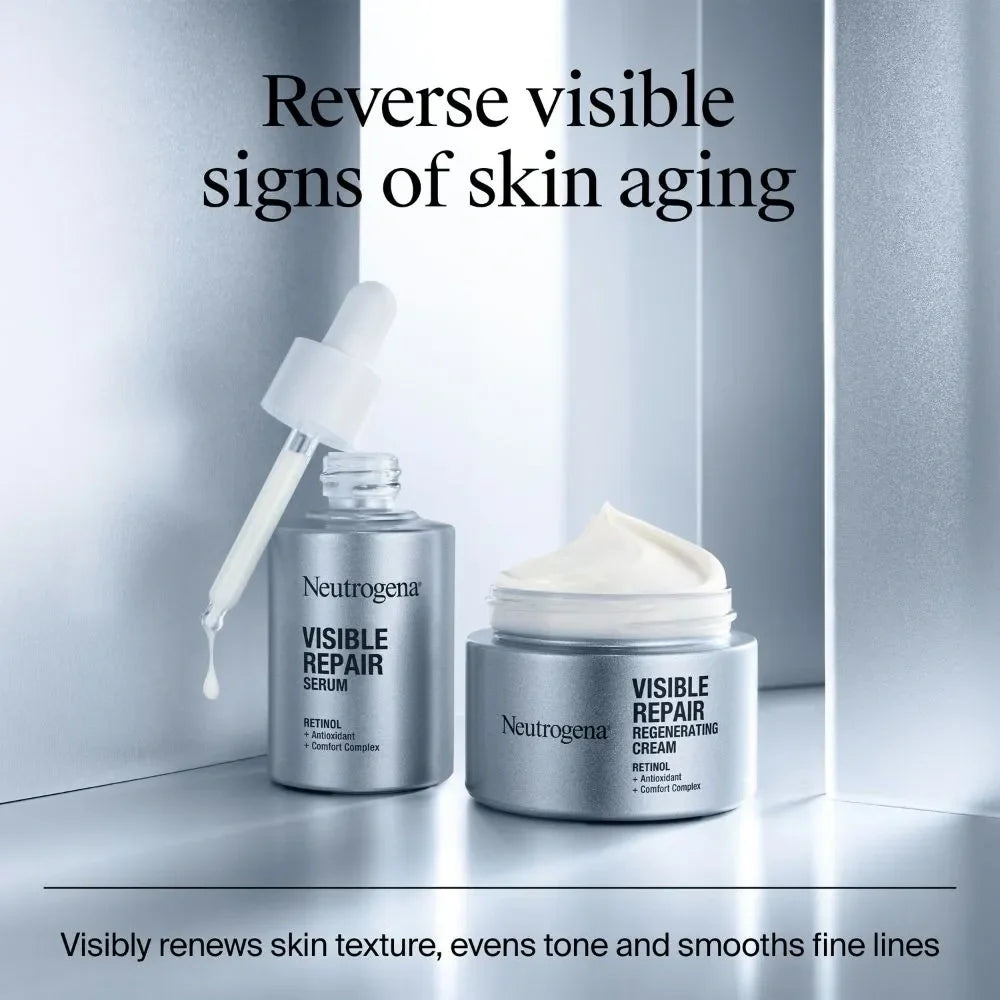 Neutrogena Visible Repair Regenerating Cream (50gm) is formulated to support skin's natural renewal process, promoting a visibly smoother and firmer complexion. This cream targets signs of aging by enhancing skin regeneration, helping to reduce the appearance of fine lines and uneven texture. Its lightweight, non-greasy formula absorbs quickly, delivering essential nutrients to restore skin’s vitality while improving overall clarity and resilience. Ideal for daily use, it supports healthier-looking skin with consistent application.