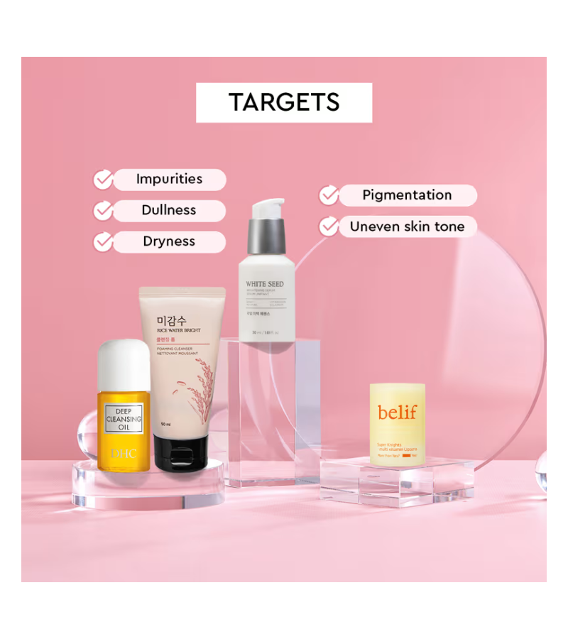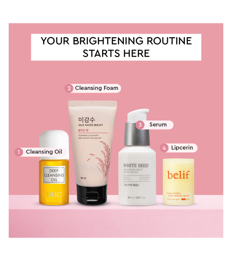 The Face Shop X Belif X DHC Combo delivers a comprehensive skincare routine with four essential products designed to cleanse, brighten, and nourish. This curated set includes a gentle rice face wash for daily cleansing, a lightweight cleansing oil that dissolves makeup and impurities, a brightening serum to enhance skin radiance, and a nourishing lip mask for soft, hydrated lips. Perfect for those seeking professional-grade skincare from trusted Japanese and Korean brands, this combo addresses multiple skin concerns in one convenient package. Ideal for establishing a complete beauty regimen or gifting to skincare enthusiasts.