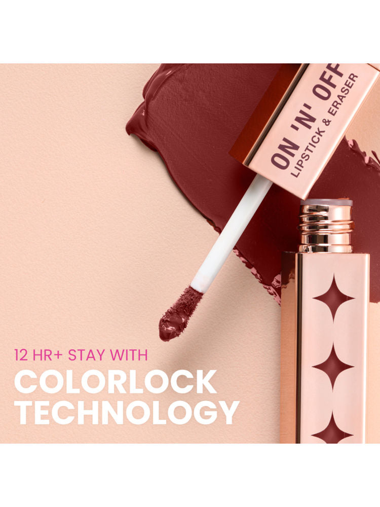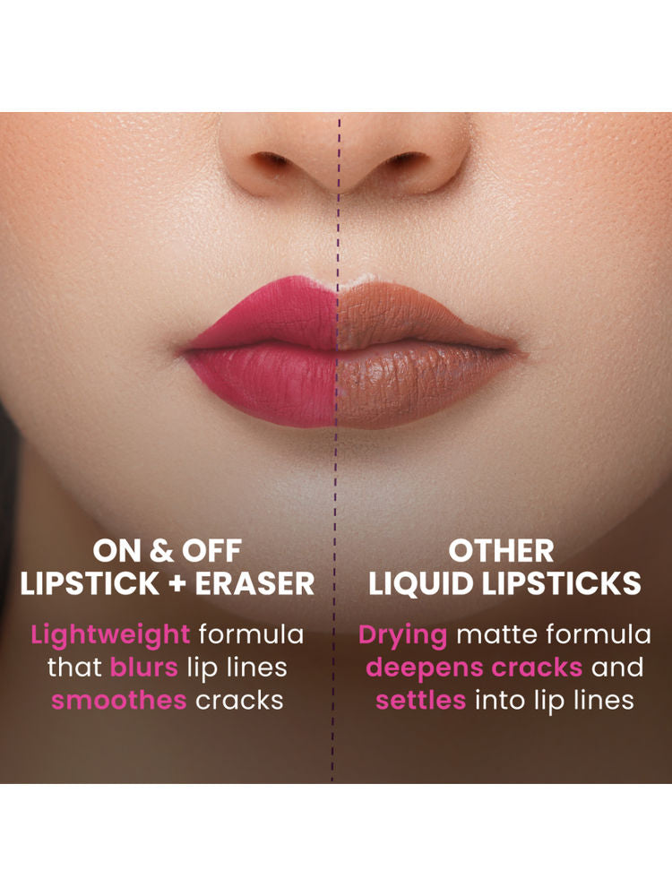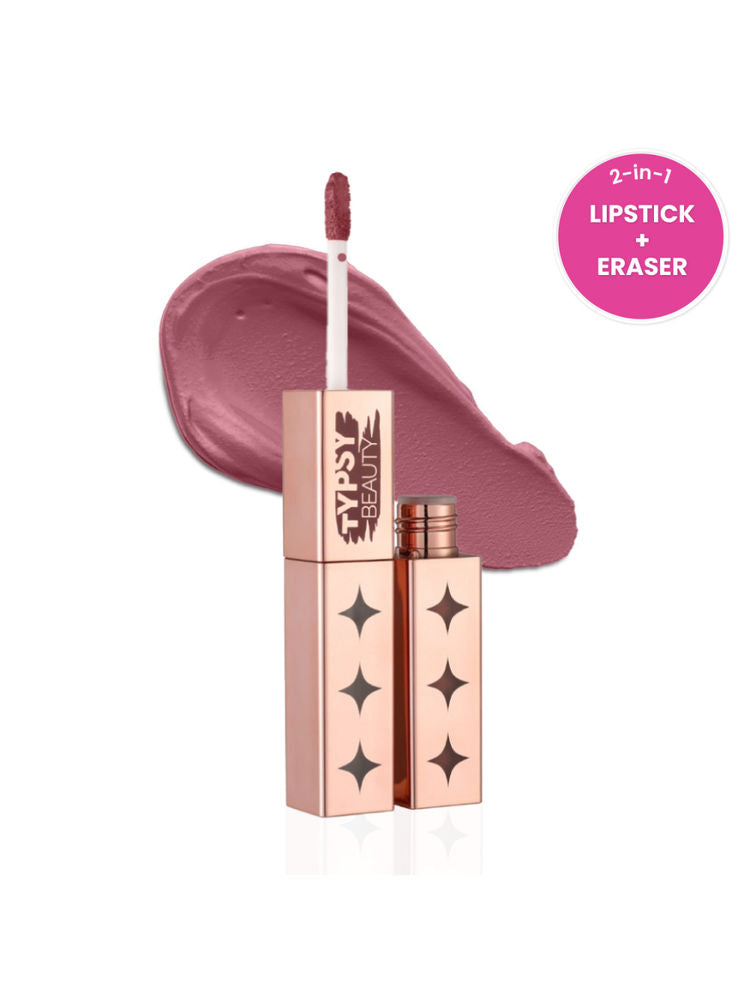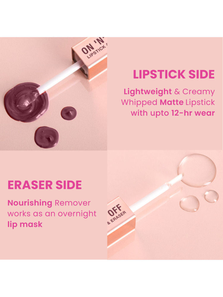 Typsy Beauty ON 'n' OFF Lipstick And Eraser features a long-wear matte lipstick on one end and a gentle remover balm on the other. The lipstick provides intense pigment and smooth application, while the remover easily erases even the most stubborn tints without drying the lips.